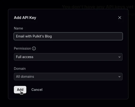 Add Domain: First, I logged into my Resend dashboard and added my portfolio domain pulkitxm.com. This is the domain from which I wanted to send emails.